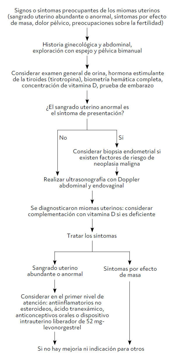 La evaluación inicial de los miomas debe incluir historia clínica ginecológica completa con exploración abdominal, con espejo vaginal, y pélvica bimanual (Figura 1).1,5